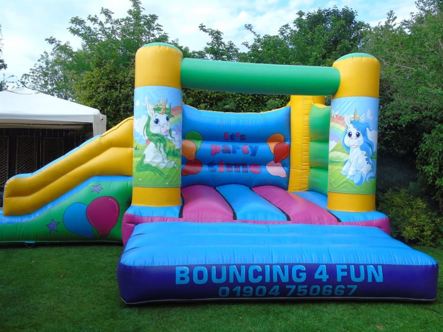 This Unicorn bouncy castle with slide is part of our unicorn range and is a very popular choice! With a low height it is ideal for halls but also great for outdoor hires. A shower cover can be provided upon request the day before the hire date if the weather looks like it's going to be showery.